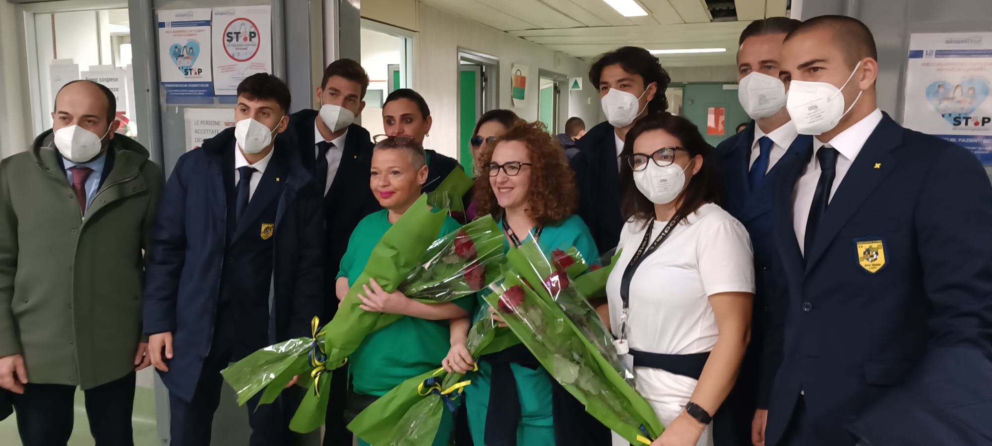 Nel corso della mattinati calciatori e dirigenti hanno anche voluto omaggiare con delle rose le colleghe dell’infermiera del pronto soccorso vittima di un aggressione.